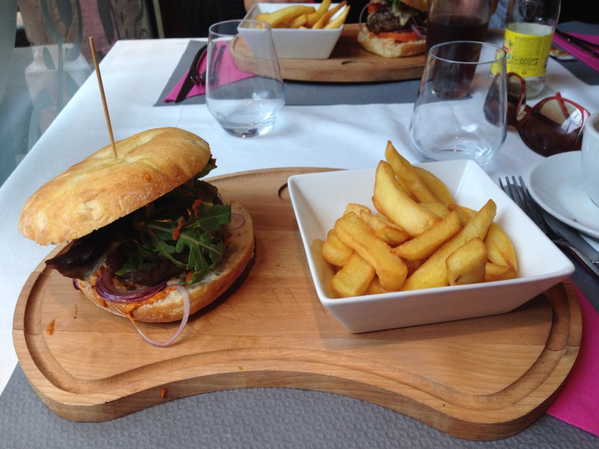 Isn’t she beautiful? Don’t dare ask me where I was when I ate this burger, all I know is that I was in Strasbourg France, we somehow stepped out of the car into a monsoon, and this was the closest cover. Soaking wet, slightly unnerved, but also hungry, we sat down in a cafe that overlooked the courtyard of the Cathedrale Notre Dame de Strasbourg.