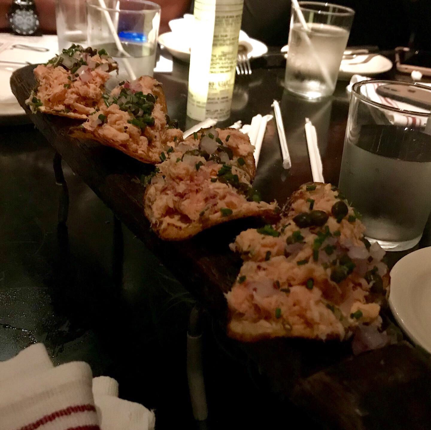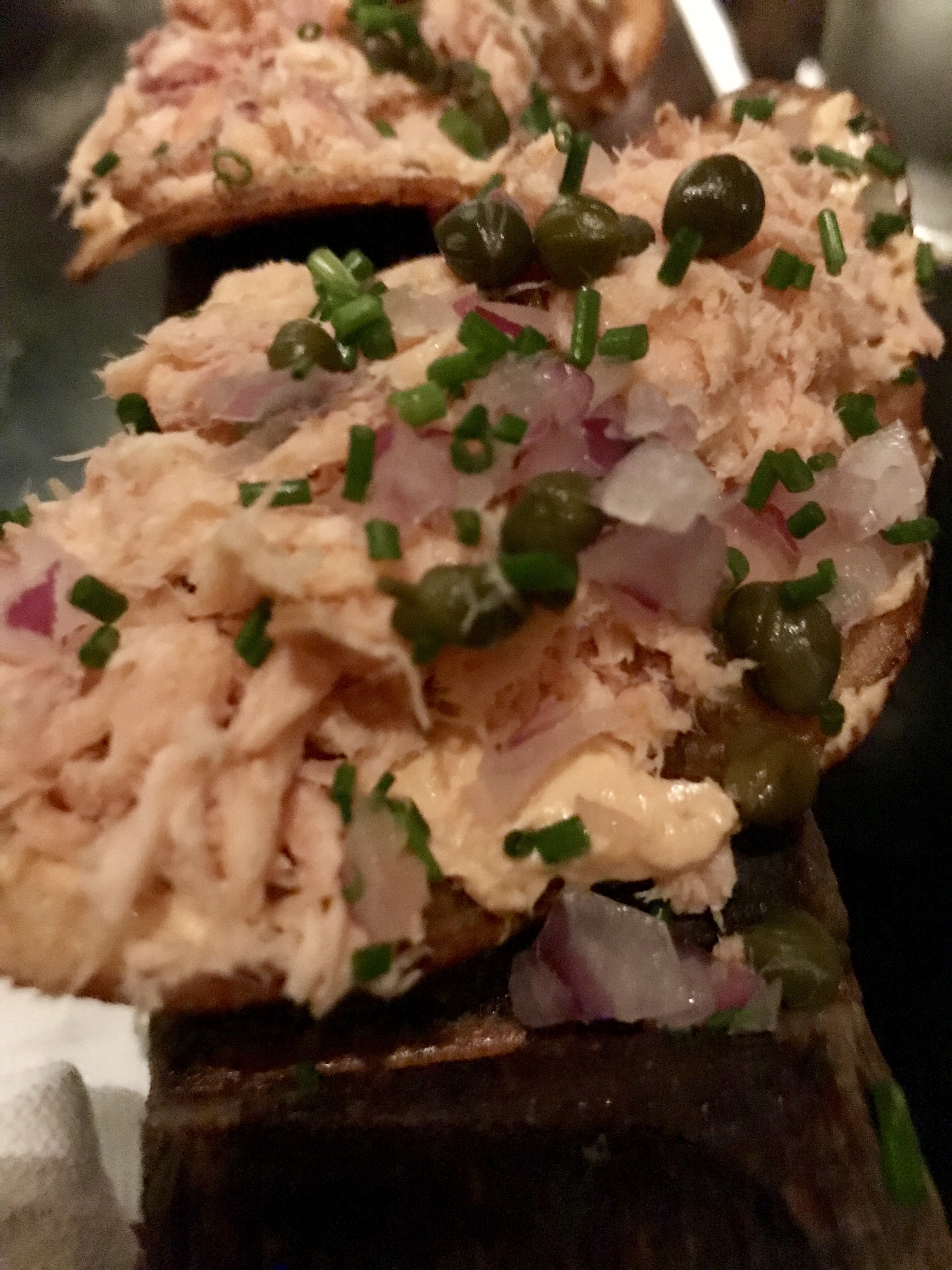 I usually enjoy a Moscow Mule, and the Salmon Chips. If you aren’t a salmon lover after your first few bites, sorry there is no hope for you. Flaky salmon, chipotle cream cheese, fine diced red onion, and kissed with capers and chives. All sitting pretty on thick kettle chips that hold just enough crunch for added texture.